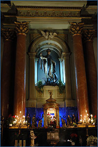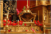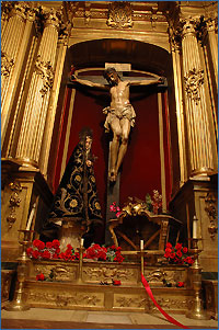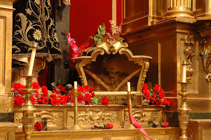 Como curiosidad, y ahora que nos aproximamos a la festividad del 14 de febrero, reparemos en que a los pies del crucificado se halla una urna de madera dorada y cristal (Fig. 13), de estilo rococó, en cuyo interior se aprecia una calavera, un par de tibias y varias osamentas más de origen indudablemente humano; un rótulo escrito en su basamento nos advierte que nos hallamos ante las reliquias de “San Valentín Mártir, Ob. Patrón de los Enamorados”.