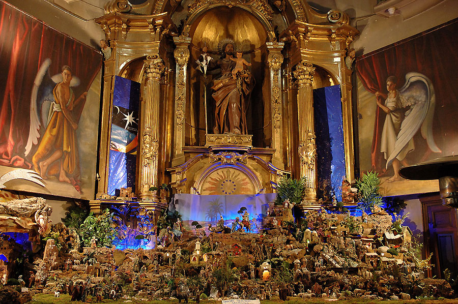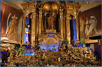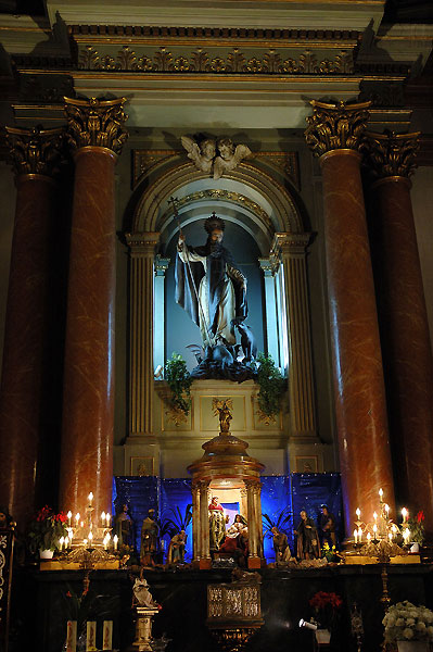 Este retablo mayor (Fig. 7) es de estilo neoclásico, al igual que el presbiterio que lo alberga, y está realizado en madera estucada y escayola policromada imitando mármol. Diseñado por el arquitecto Francisco Rivas, y dirigido por el referido Francisco Cano, se finalizó en 1802. Se compone, en sus distintas partes, de banco, cuerpo de una sola calle y ático. Sobre el banco se apoyan cuatro grandes columnas de orden corintio, agrupada dos a dos; las interiores, algo más adelantadas. En el propio banco destaca el tabernáculo en forma de templo circular y con columnas y pilastras compuestas, sustentadoras de una cúpula que remata en una pequeña representación de la Fe. Como “hasta San Antón, Pascuas son”, cuando visitamos el templo la víspera de su festividad, pudimos contemplar el banco del retablo ocupado por los pastores y los Magos de Oriente (sobre los que volveremos después) y el propio templete acogiendo una moderna representación del Misterio.