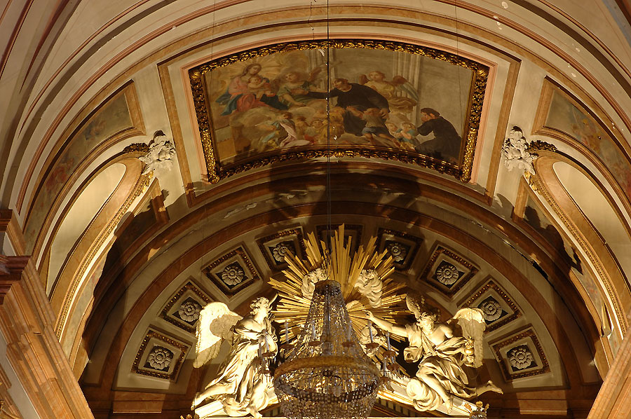 Por último y en relación al presbiterio, es reseñable el fresco que adorna la bóveda; en el mismo se representa a San José de Calasanz acompañado de varios alumnos (Fig. 9). Es una pintura de discreta calidad, datable en el primer tercio del siglo XIX, que anteriormente no se distinguía y que con la nueva disposición de unos focos ahora se percibe en su plenitud.