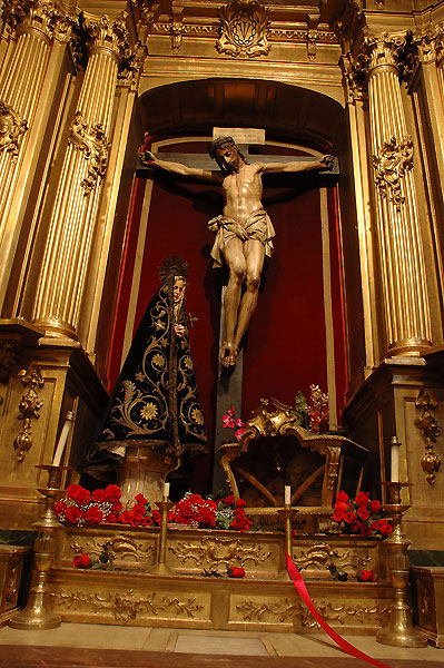 La siguiente y última capilla, hacia los pies del templo, nos permite admirar un nuevo retablo, también de madera dorada y estilo neoclásico, similar al que alberga al frontero, ya descrito, de la Inmaculada Concepción. Tuvo que ser cortado en su parte superior para poder dar cabida al órgano que se sitúa encima de esta capilla. Con dos pares de columnas estriadas corintias que delimitan un vano de arco escarzado, destaca ante todo por la escultura que se alberga en el mismo: el conocido como Cristo de los Niños (Fig. 12).