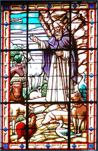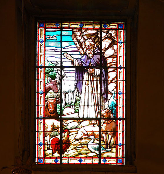 Y como remate de la visita contemplamos el coro al que ilumina y alegra un ventanal cerrado por una vidriera decimonónica, con la ingenua y encantadora representación de San Antón en acto de bendecir a varios animales domésticos (Fig. 14).
