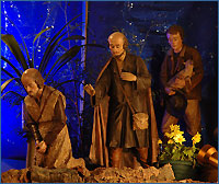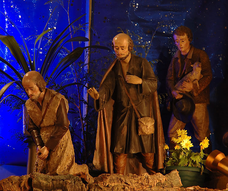 Las antedichas imágenes, por el contrario, son de un valor artístico más que notable. Datables los dos grupos en el siglo XVIII, por sus características estilísticas muestran que han salido de las manos de un mismo artista, y los dos grupos, tanto el de los Pastores (Fig. 15) con sus sencillas vestiduras campesinas compuestas de coletos de piel de oveja, jubones, calzones y mantos, tan características de los ambientes rurales de los siglos XVII Y XVIII, como el de los Magos (Fig. 16), éstos convencionalmente ataviados con vestiduras regias de progenie medieval, muestran paralelismos indudables. Sus respectivas agrupaciones muestran una disposición simétrica. Así, podemos observar en ambos casos una primera figura arrodillada, en tanto las dos restantes se acercan en actitud reverencial. Corporalmente manifiestan contención y elegancia. Asimismo, la expresividad del rostro de todas las figuras es muy similar; muestran gestos plácidos y serenos, en los que destacan la profundidad e inteligencia de sus miradas.