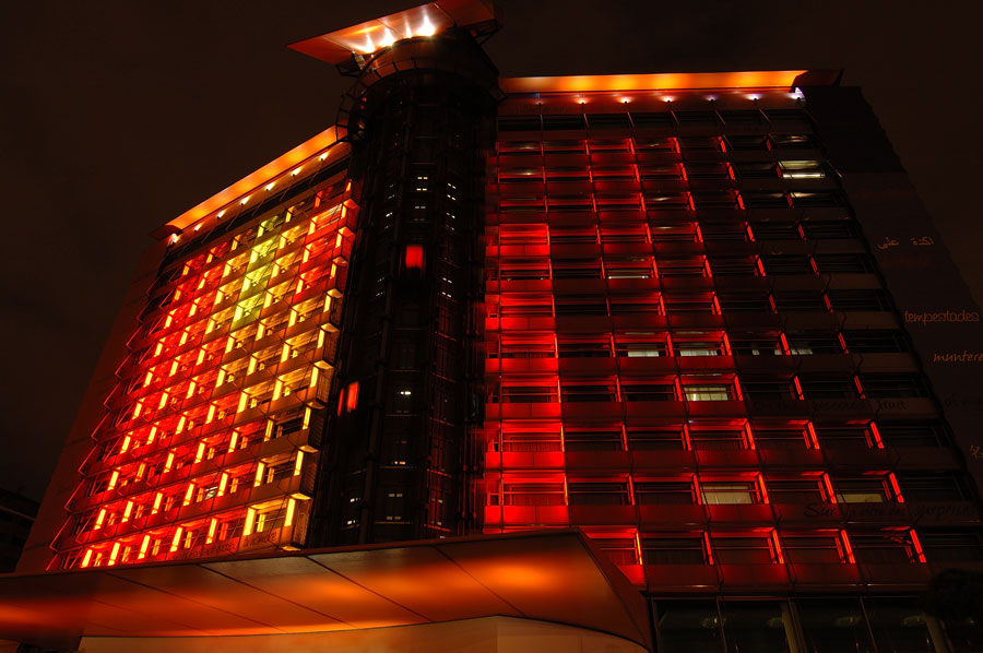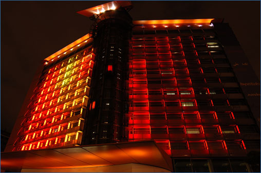 Es una de las partes más vistosas del edificio. Al encontrarse en una de las arterias de acceso a la capital, concretamente en la Avenida de América, son muchos los madrileños que pasan por delante en su camino hacia el lugar de trabajo. También es de paso casi obligado para los turistas que vienen desde el aeropuerto, por lo que foráneos que visitan nuestra ciudad observarán sus llamativos colores desde la distancia, destacando sobre la negra noche y el resto de edifcios colindantes, la mayoría de oficinas. La ilumiación y decoración exterior del hotel fue tema de conversación desde sus inicios, y aún hoy, pone de relieve opiniones encontradas sobre la estética de este singular edificio. La fachada es obra de Jean Noveal, y desde luego, no deja indiferente a nadie.