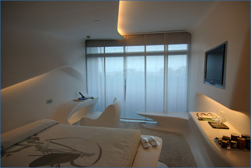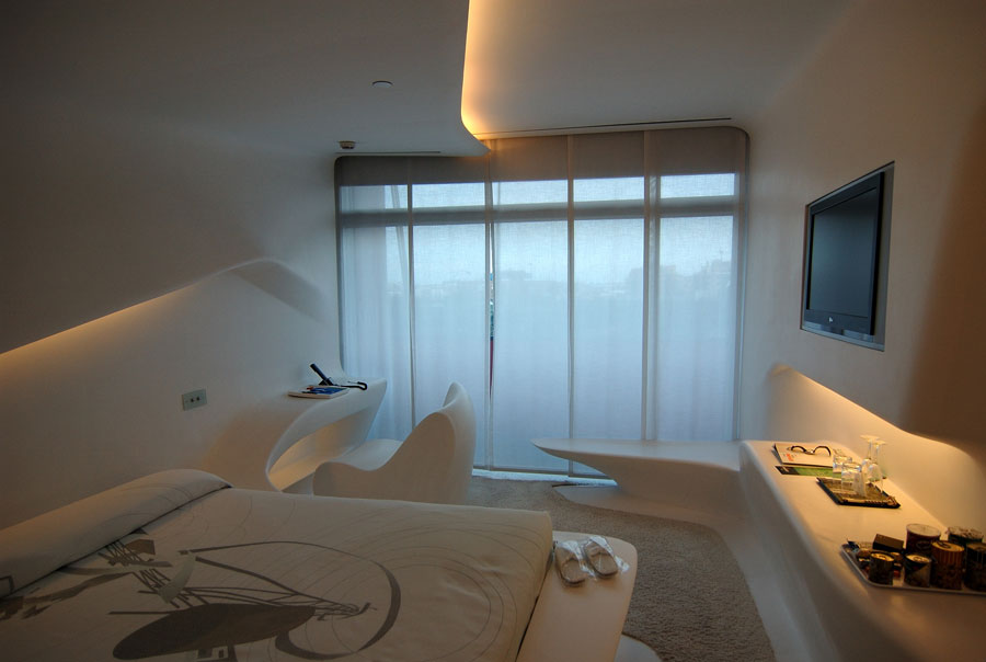 En este hotel Silken, Zaha Hadid juega con materiales que dan un aspecto futurista, de ciencia ficción, a la habitación. Todo es un continuo, que sale de la pared de lineas curvas y suaves. El material que ha empleado es LG Hi-Macs, que es una piedra acrílica que aporta un acabado espectacular, como se puede ver en las siguientes fotografías.