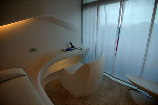 Las paredes son unos paneles con lucecitas de colores que se muestran cambiantes según el movimiento del huésped. El diseño parece futurista e invita al visitante a pensar en una sala de control más propio de una película de ciencia ficción.