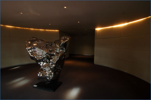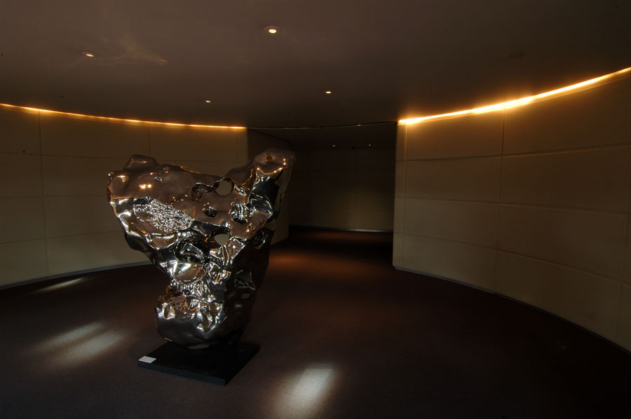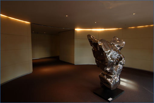 Nada más salir del ascensor, nos encontramos con una escultura obra de Chillida que parece hecha en metal líquido, simulando al cromo. Chillida, amigo personal de Norman Foster, aporta parte de su espíritu al trabajo desarrollado por el arquitecto.