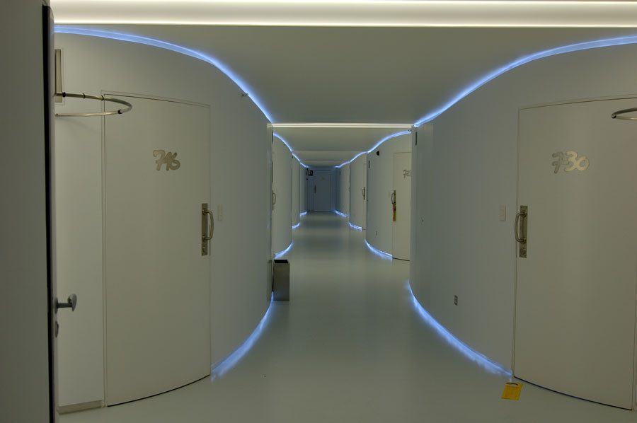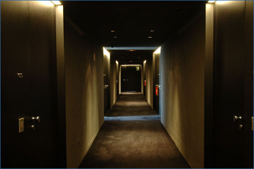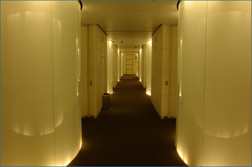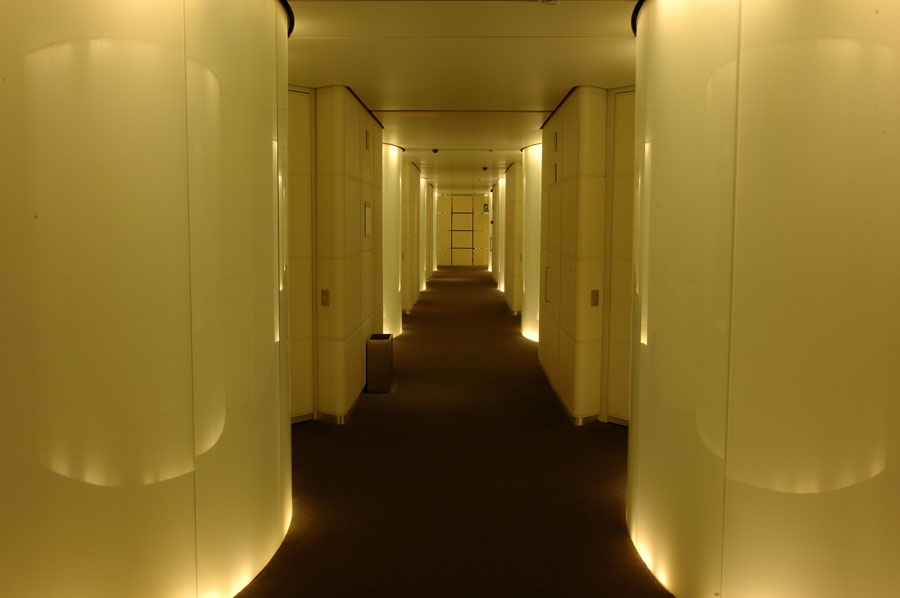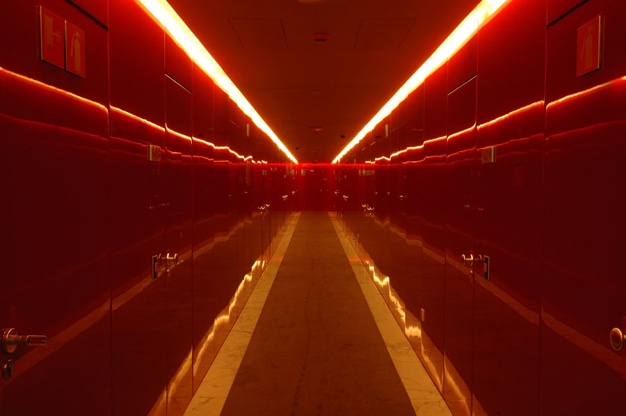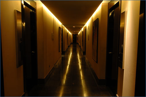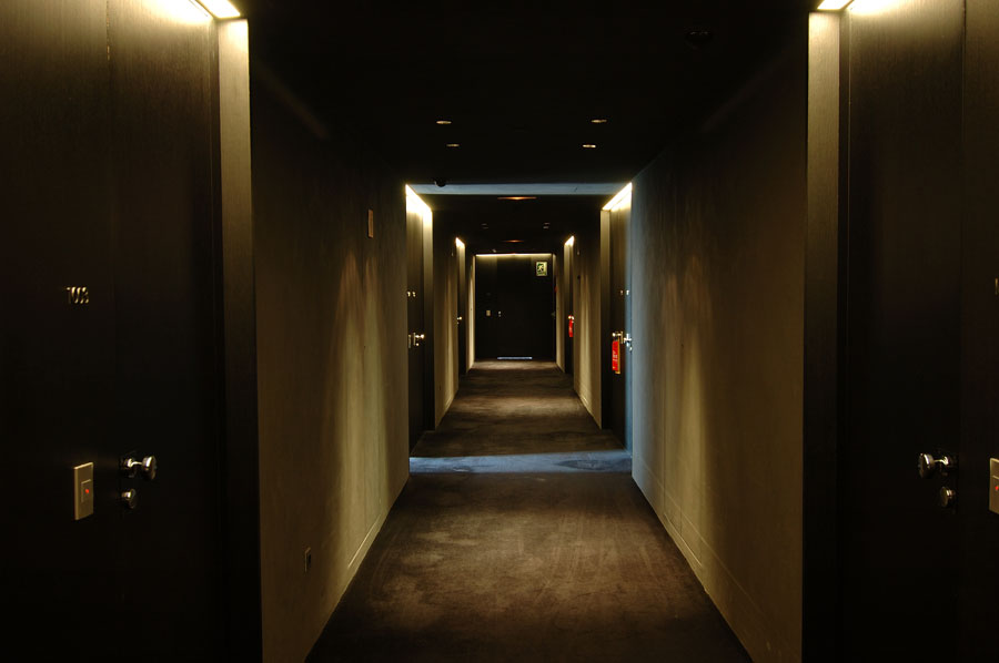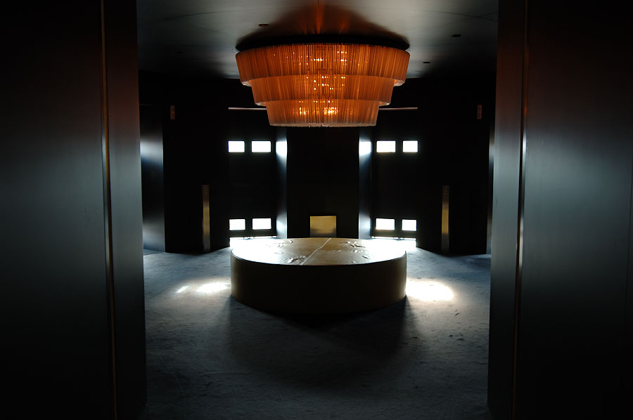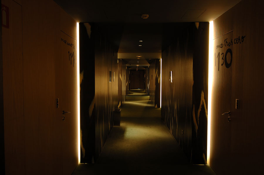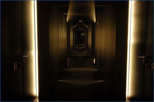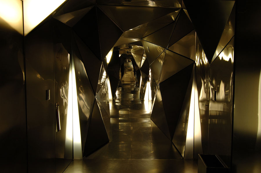 Según se sale de los ascensores nos topamos con la gran lámpara circular de cristal de murano y unas paredes en dm lacado completamente negras. Los pasillos aportan una percepción de profundidad. Y unos haces de luz triangulares surgen del techo y a ras de suelo, lo que da un cierto aspecto hipnótico al pasillo.