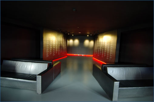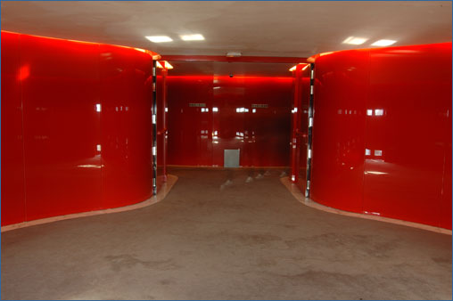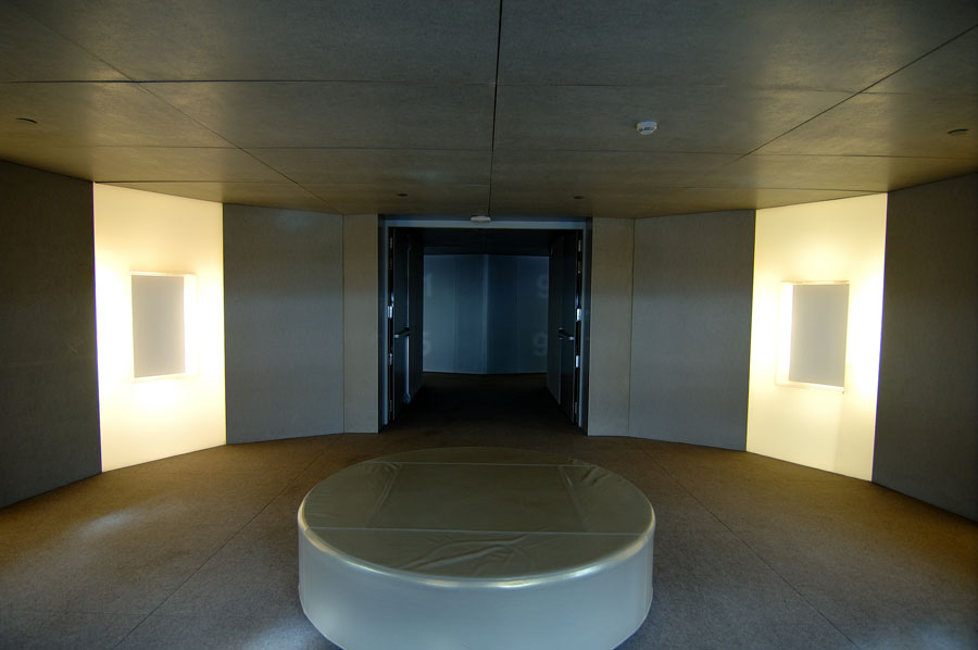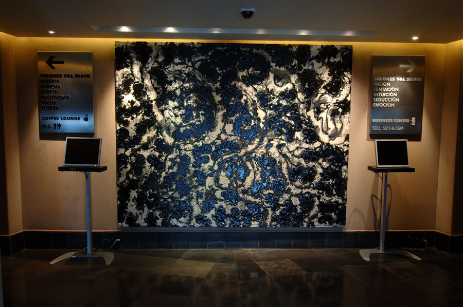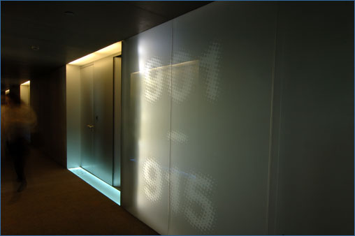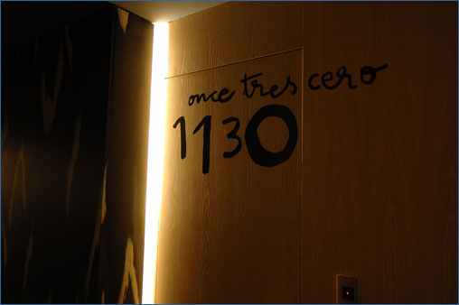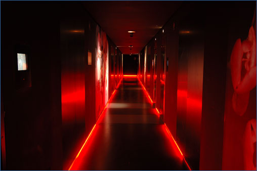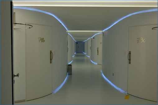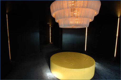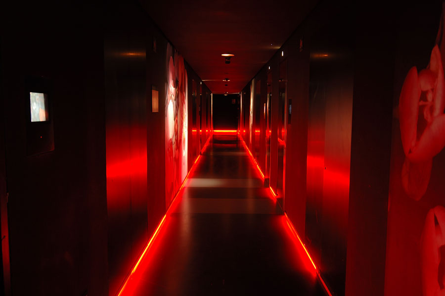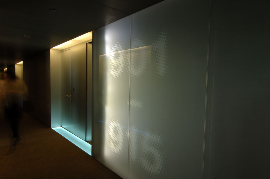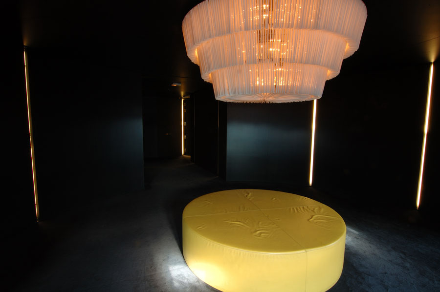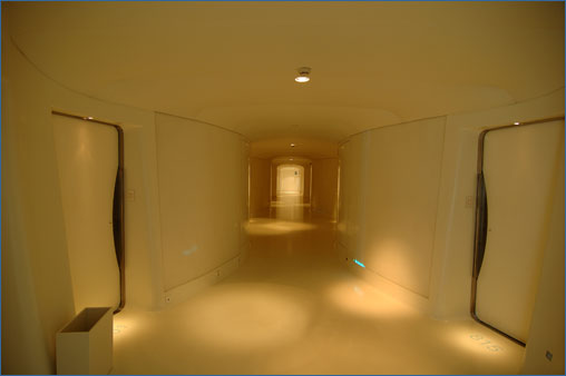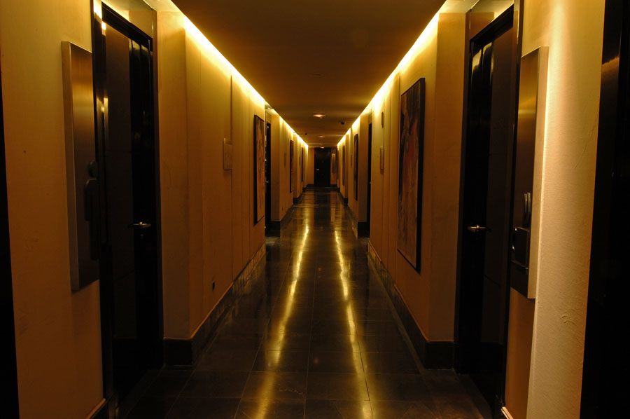 Según se sale de los ascensores nos topamos con la gran lámpara circular de cristal de murano y unas paredes en dm lacado completamente negras. Los pasillos aportan una percepción de profundidad. Y unos haces de luz triangulares surgen del techo y a ras de suelo, lo que da un cierto aspecto hipnótico al pasillo.
