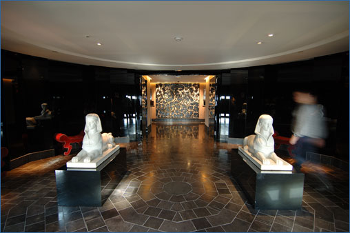 El suelo del hall sigue un motivo octogonal que podría recordar al de un patio cordobés. Mientras que las paredes son de laca negra, y las butacas de un terciopelo rojo intenso. En el centro hay dos esfinges de mármol blanco, y al fondo una pintura que aporta mucho equilibrio al conjunto, y permitiendo el tránsito hacia el pasillo, que rompe la continuidad siendo las paredes de terciopelo beige.