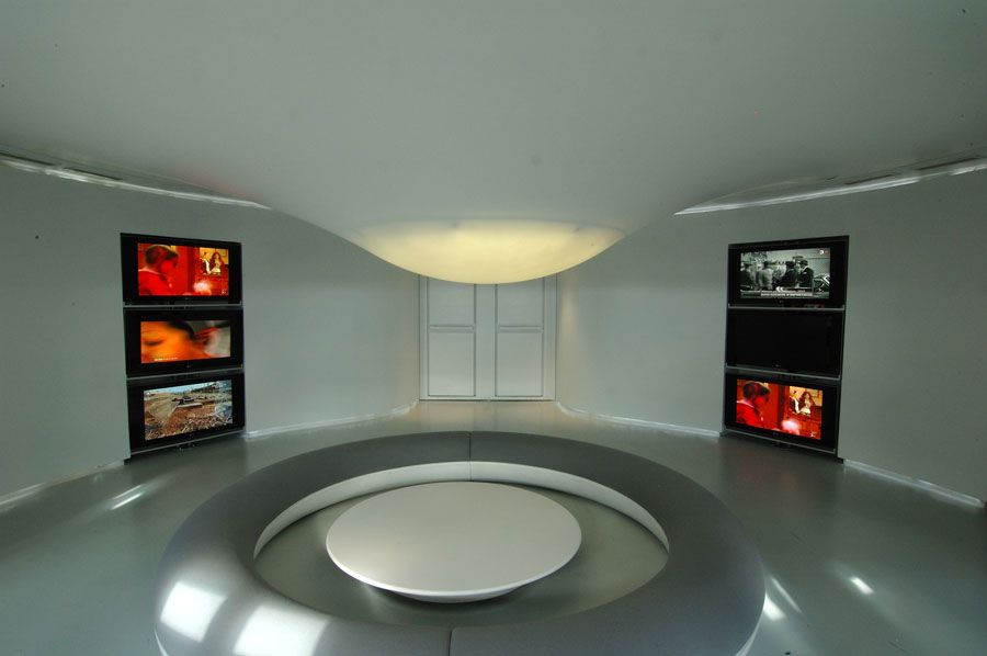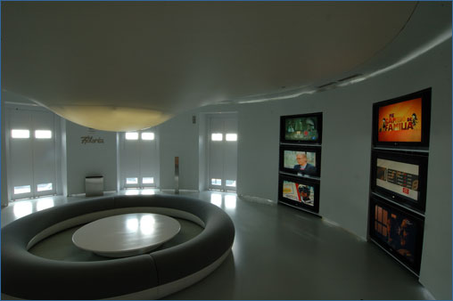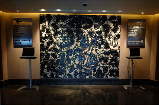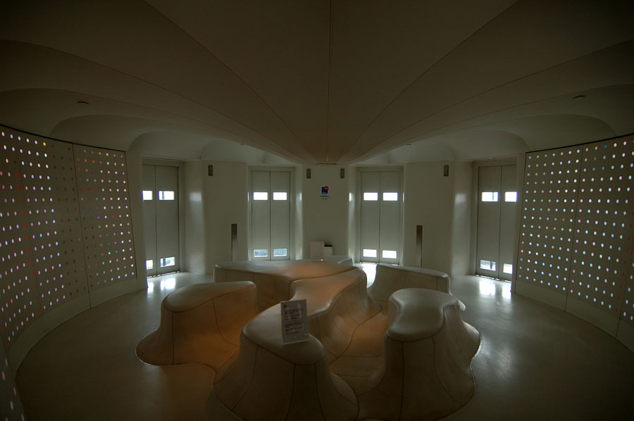 El lobby me transporta al interior de una nave espacial con ese diseño futurista y las paredes llenas de pantallas, más propio del interior del Enterprise. Lo primero que se ve es un sofá circular hecho con fibra de vidrio reflectante y el techo, que se curva hacia abajo, como si fuera de goma y un líquido resplandeciente se acumulara en su interior y, por acción del peso, lo deformase.