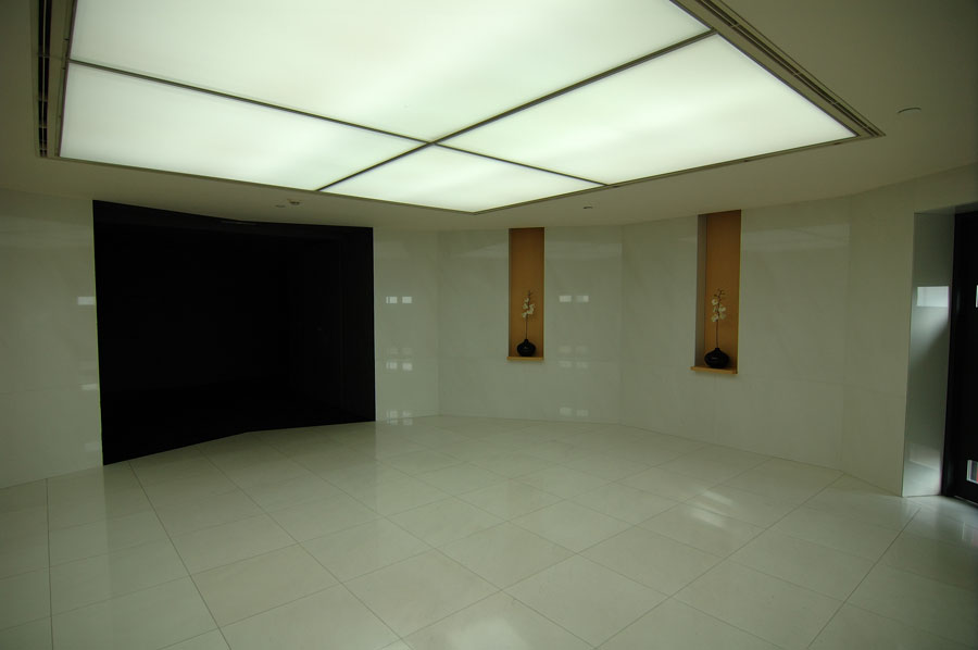 En el lobby se puede observar un decágono, propio de los elementos geométricos que gustan a Isozaki. Todo esta solado de mármol que hace un fuerte contraste con lo oscuro de los pasillos, que han sido pintados de gris, con un tacto rugoso, y una moqueta de lana negra.