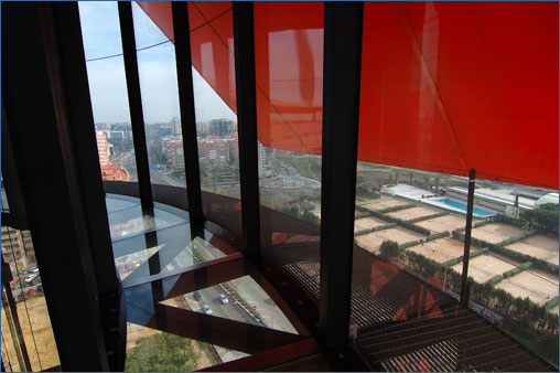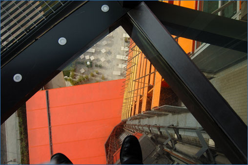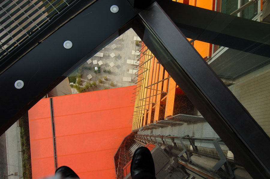 Otro de los elementos que destacan en esta última planta es un mirador, que consiste en un pasillo de cristal en forma de semicírculo, que te permite andar por "fuera del edificio", y que al caminar por él, da la sensación de estar pisando sobre el vacío como se puede ver en las fotos.