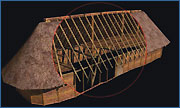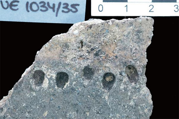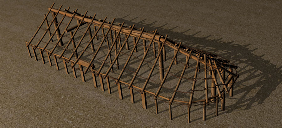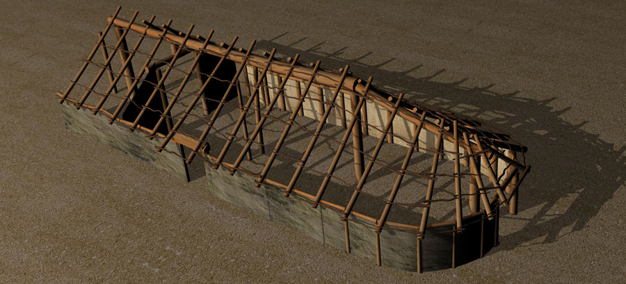 En el interior de los hoyos se documentaron restos de madera, cerámica, piedra y adobes o arcilla apisonada. Tanto las piedras y los restos de vasijas cerámicas de gran tamaño servirían de calzo a los postes de madera. En la parte sureste de la estructura se localiza lo que interpretamos como el acceso a la misma, que tendría forma porticada.