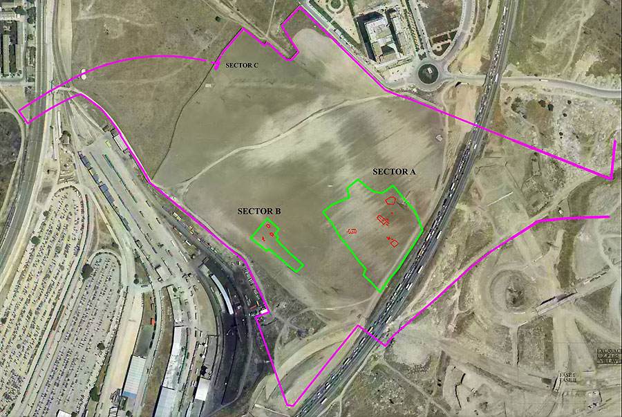 Asimismo, al norte del complejo excavado se documentaron varias estructuras en forma de fosas y silos, que se agrupan genéricamente como Sector B. Los restos aparecidos se encuentran localizados sobre una suave loma de ligera pendiente que se va matizando paulatinamente hasta descender hacia la llanura aluvial del río Manzanares, dominando la margen derecha del arroyo Butarque, poco antes de su desembocadura aguas abajo en el río Manzanares. Se trata de manchas de rellenos con altos contenidos en materia orgánica que colmatan antiguas fosas de formas y tamaños diversos, entre las que se pueden aislar algunos hoyos o silos cuya finalidad originaria debió ser la de depósitos de alimentos.