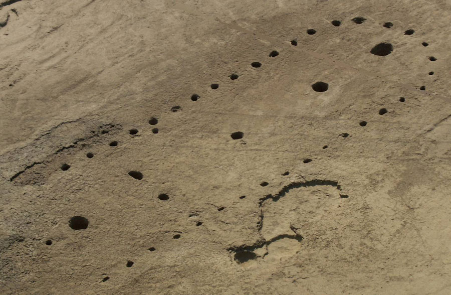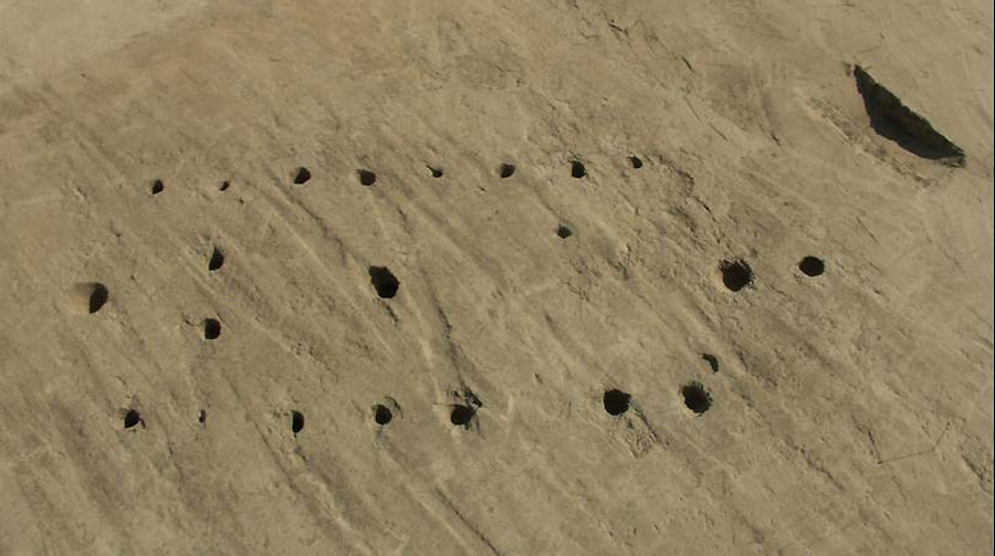 No cabe duda de que uno de los elementos más extraordinarios descubiertos en las excavaciones de Las Camas, son las dos cabañas definidas por una serie de agujeros de poste. Tanto el tamaño de estos agujeros como la superficie que delimitan conforman dos unidades constructivas de tamaño singular, que prácticamente no tienen paralelos en la prehistoria española.
