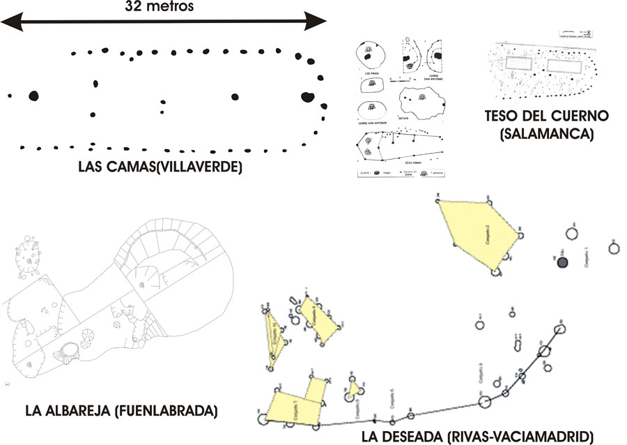 En el panorama español la existencia de longhouses o casas largas es prácticamente desconocida, predominando las pequeñas cabañas de planta oval o redonda. Uno de los primeros ejemplos documentados en el Centro Peninsular, es el del cercano yacimiento de Ecce Homo, donde se excavó una cabaña de 10,5 m. de largo por 2-4 m. de ancho, delimitada por postes y un perímetro excavado. Pequeñas cabañas de tendencia oval se han hallado en el Sector III de Getafe, en el Cerro de San Antonio (Vallecas) o en Los Pinos (Alcalá de Henares) y, recientemente, en el yacimiento de Capanegra (Rivas-Vaciamadrid), donde la planta de la estructura es cuadrangular, de 6 a 8 postes, una sola nave y espacio interno en torno a 10 m2 , así como en el enclave de El Colegio (Valdemoro).