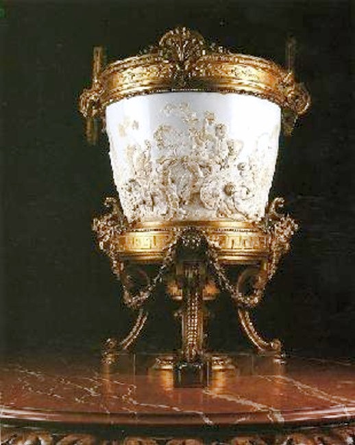 De esa misma plaza, donde en 1870 comenzará a levantarse el llamado antiguo mercado de la Cebada, de innovadora arquitectura en hierro y cristal, desaparecerá nuestra fuente protagonista en 1840, si bien, el arte nos ha dejado buena memoria de ella, comenzando por el plano de Teixeira hasta los aguafuertes de Louis Meunier, del S. XVII, o el grabado realizado por Haered y el óleo de Manuel de la Cruz y Cano, depositado en el Museo Municipal, del S. XVIII. Precisamente, del Siglo de las Luces, encontramos una nueva reproducción de la Fuente de la Plaza de la Cebada, y en un soporte realmente singular y exquisito: se trata de un soberbio Vaso ornamental de porcelana, realizado en la Real Fábrica del Buen Retiro, al que se añaden aplicaciones y pie de bronce dorado de gusto francés.